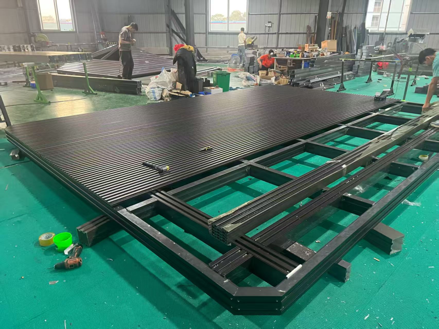 Profile aluminiowe są wstępnie wykończone farbą proszkową, co nadaje im czysty wygląd, a jednocześnie poprawia trwałość na zewnątrz. Po zabezpieczeniu ramy, panele żaluzjowe są układane jeden po drugim. Pracownicy sprawdzają odstępy, prostotę i dopasowanie na bieżąco, zamiast czekać do końca. Jest to prosty proces, ale dbałość o szczegóły sprawia, że późniejsza instalacja przebiega znacznie płynniej.